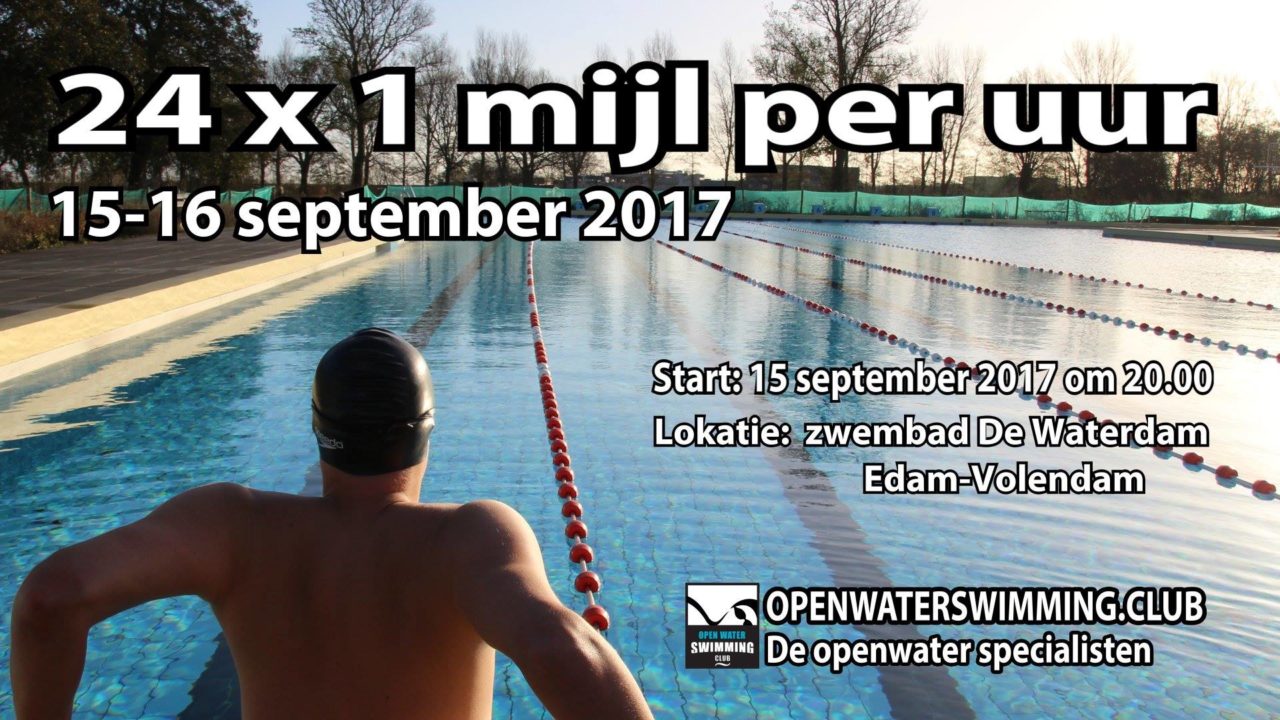 Speciaal voor de mensen die aan het einde van het open waterseizoen nog één keer hun grenzen willen verleggen: 24 x 1 mijl per uur zwemmen in de Waterdam te Volendam. Er word op vrijdag 15 september gestart om 20:00 uur, de finish is op zaterdag 16 september om 20:00 uur.