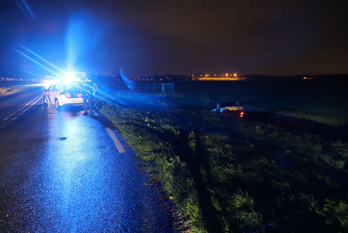 Op de Bamestraweg in Middenbeemster is vanavond een personenauto op zijn kop in de sloot beland.