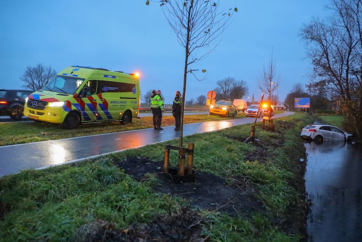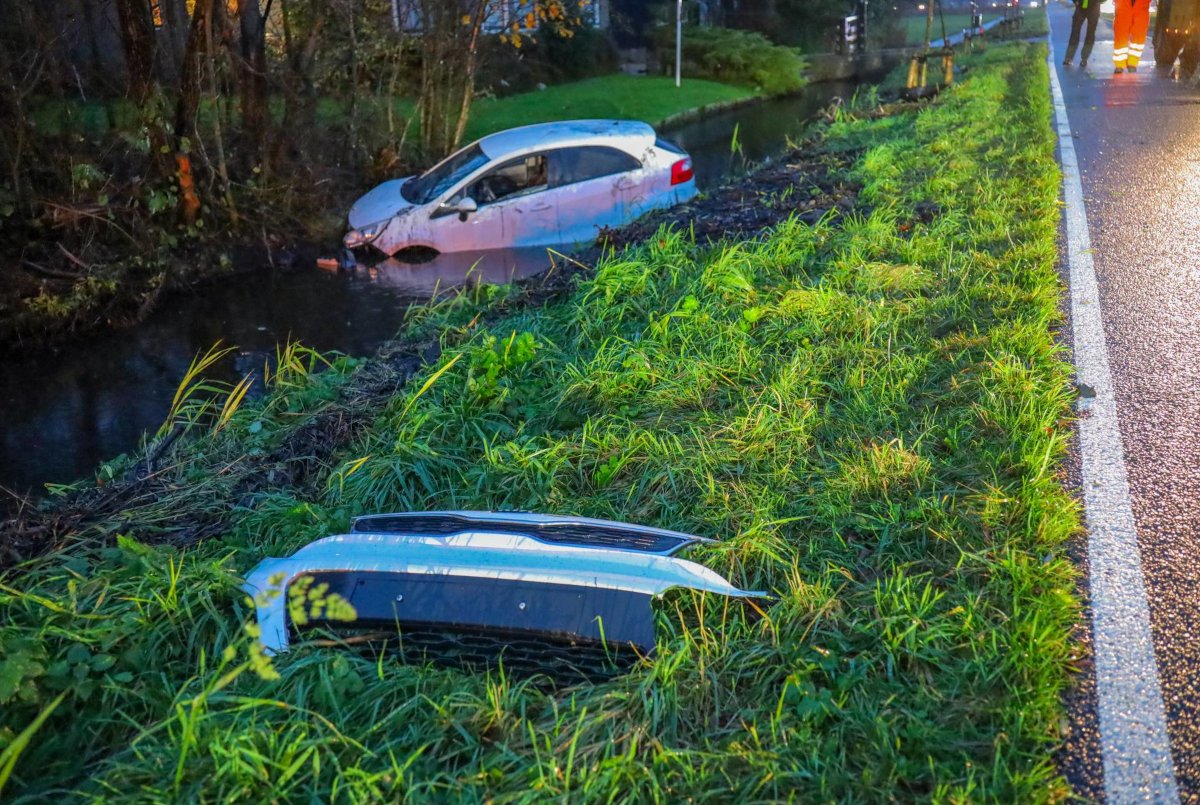Om nog onbekende reden verloor de bestuurder de macht over het stuur. De auto kwam eerst tegen een hectometerpaaltje aan, ramde vervolgens een boompje en belande toen in het water.