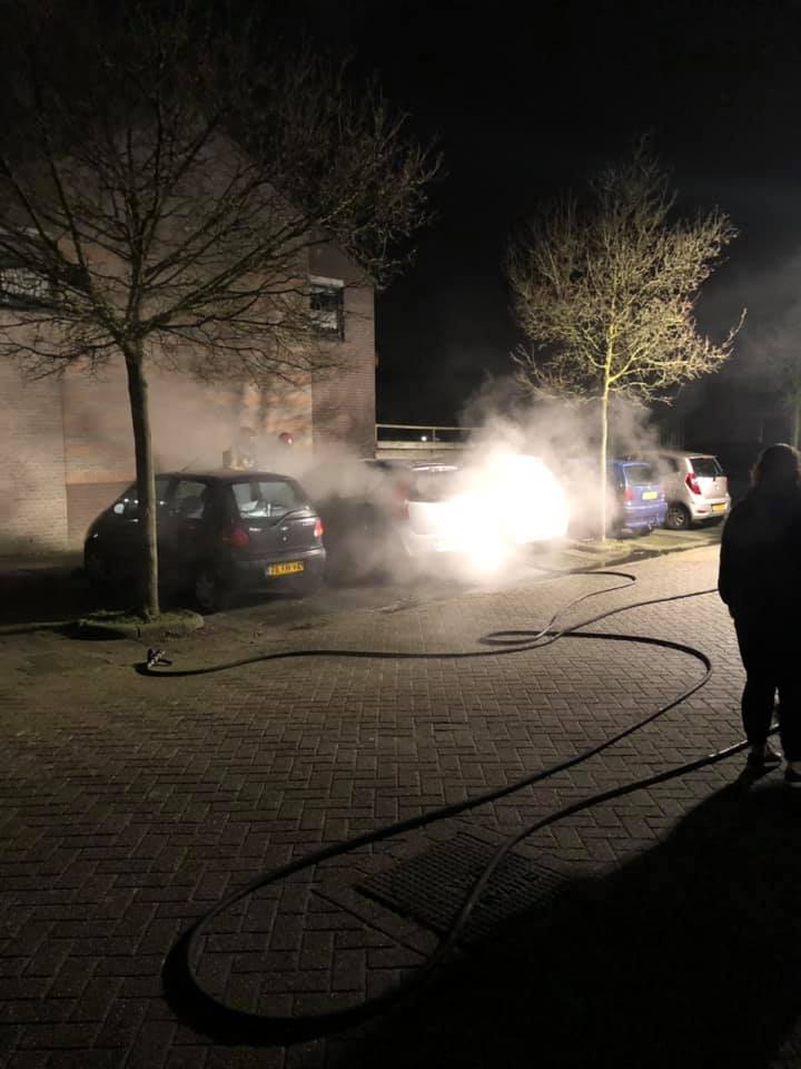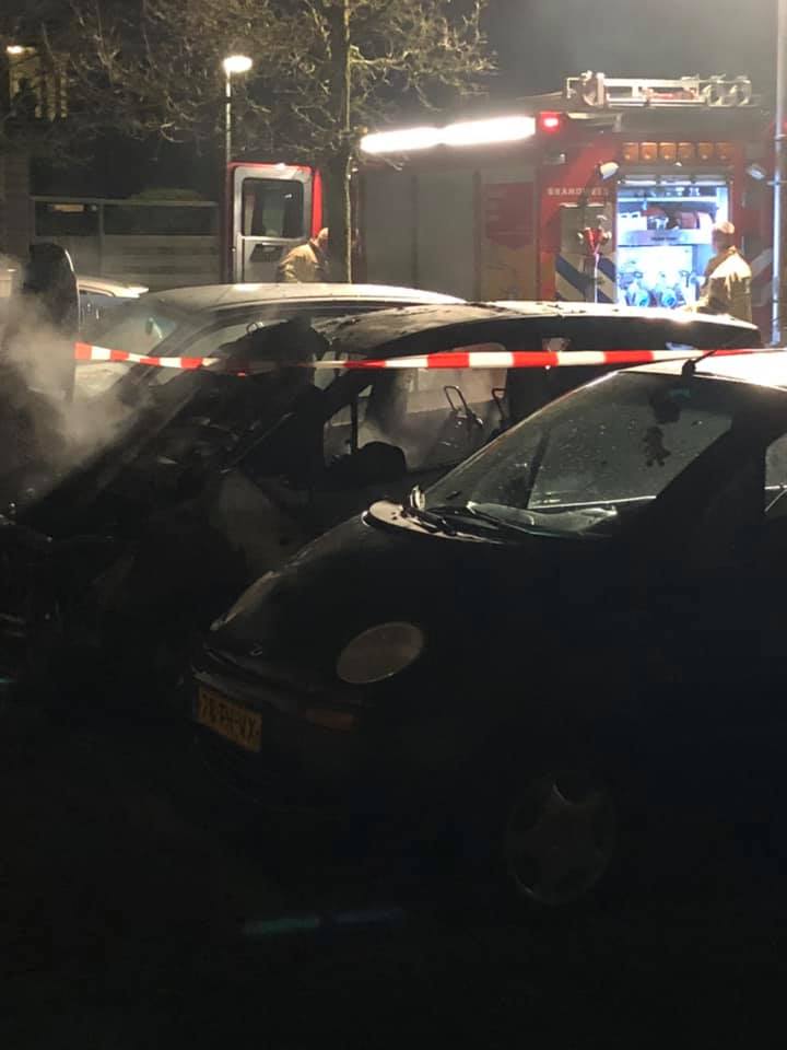 De melding van de brand kwam rond even voor half vijf binnen. De brandweer was snel ter plaatse, maar kon helaas niet voorkomen dat twee auto’s zwaar beschadigd raakten en een derde auto schade opliep door de hitte. Agenten hebben in de buurt nog gezocht naar twee personen die wegrenden bij de brand.