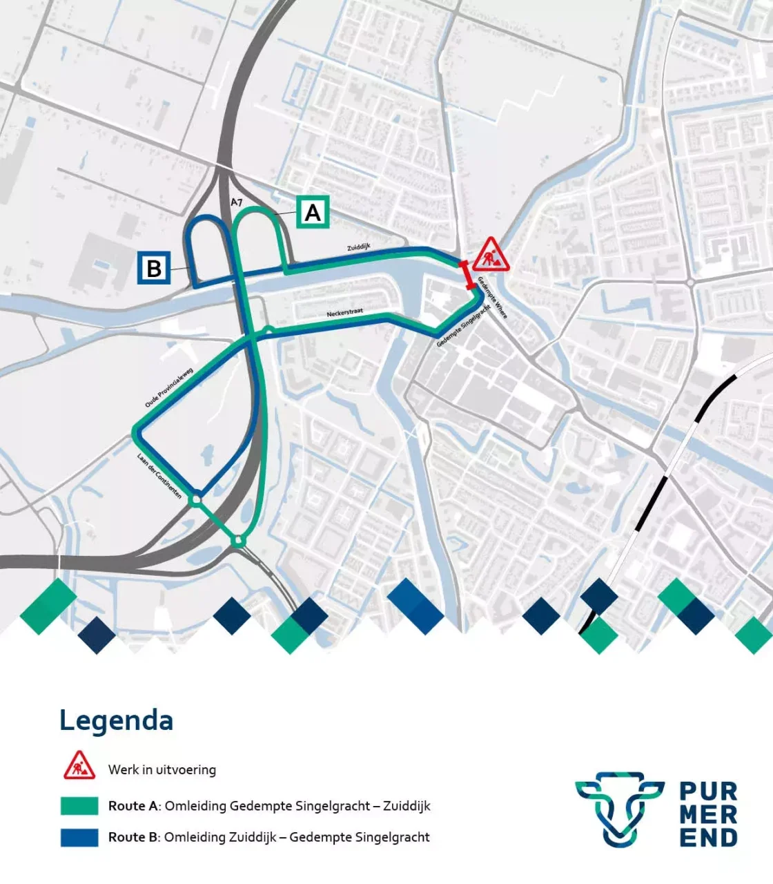 Er is een omleiding. De kortste route is via afrit 4 en 5 van de A7, richting de Zuiddijk aan de noordzijde en de Gedempte Singelgracht aan de zuidzijde. Langs de weg staan borden met informatie over de afsluiting en de omleiding. Tijdens de werkzaamheden is er geen doorgang voor het vaarverkeer.