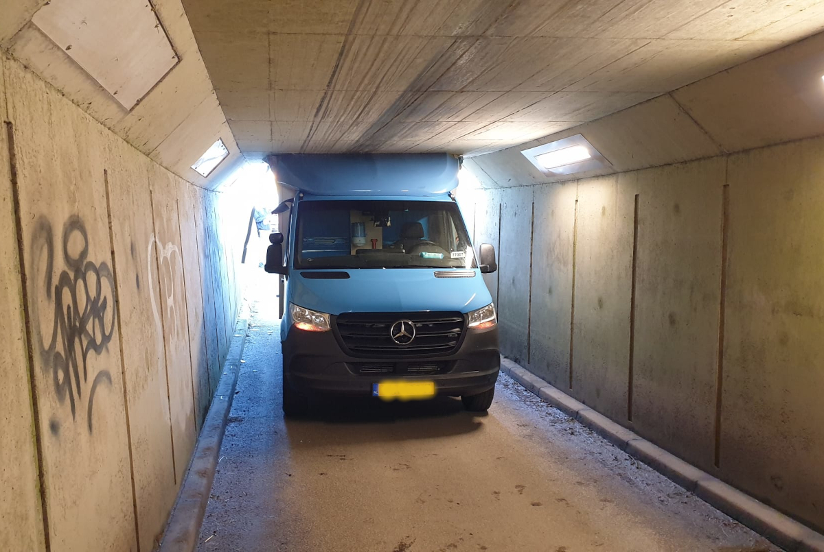 Voor het viaduct geldt een maximale doorrijhoogte van 2,4 meter. De chauffeur had dat waarschijnlijk over het hoofd gezien en had kennelijk ook niet het ruimtelijk inzicht om zelf te kunnen inschatten dat de bestelwagen te hoog was om door het tunneltje heen te kunnen. De wagen kwam dus klem te zitten.