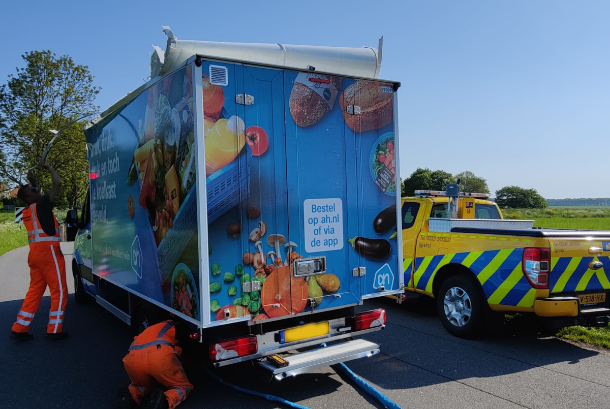 Middenbeemster – Rond negen uur vanochtend is op de Nekkerweg in Middenbeemster een bezorgwagen van Albert Heijn gestrand. Het ging mis bij het viaduct onder de N244 door.
