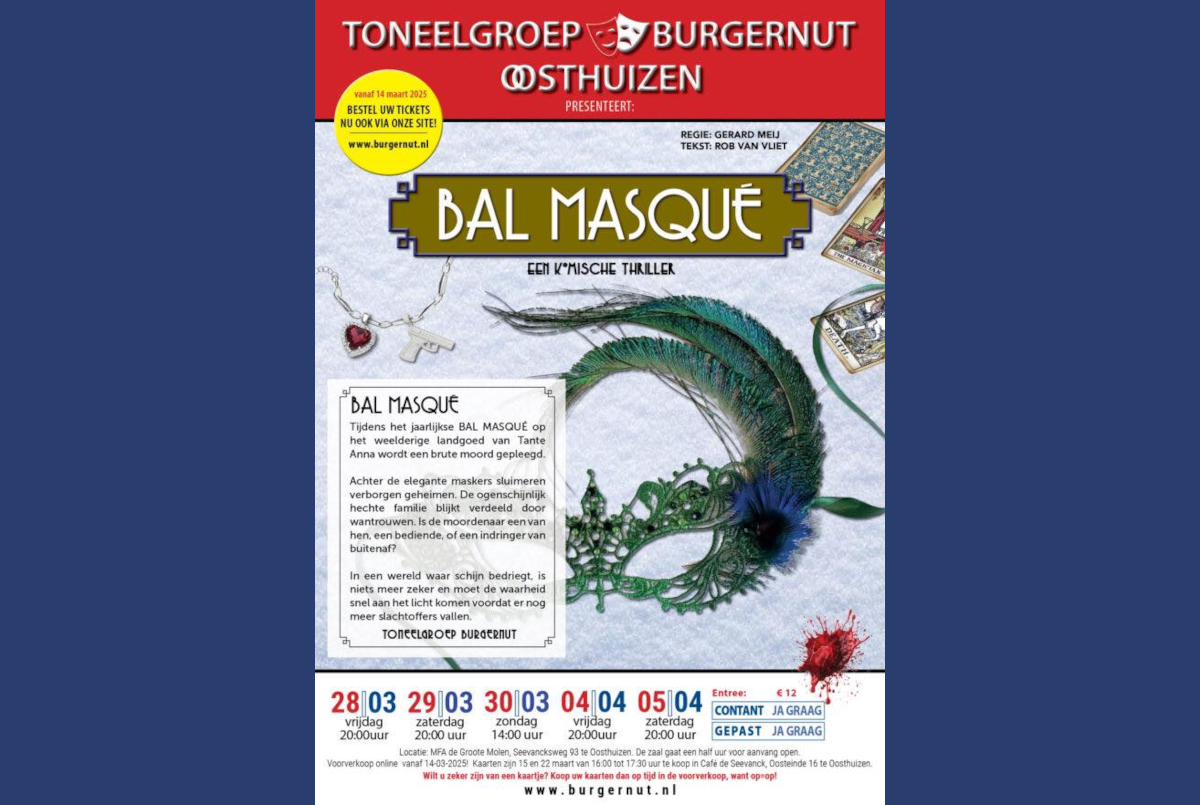 Op 28, 29 en 30 maart en 4 en 5 april a.s. speelt Toneelvereniging Burgernut een komische thriller met als titel: “Bal Masqué”. De voorstellingen zijn in MFA De Groote Molen in Oosthuizen op vrijdag 28-03, zaterdag 29-03, vrijdag 05-04, zaterdag 05-04 om 20.00 uur en op zondag 30-03 om 14.00 uur.