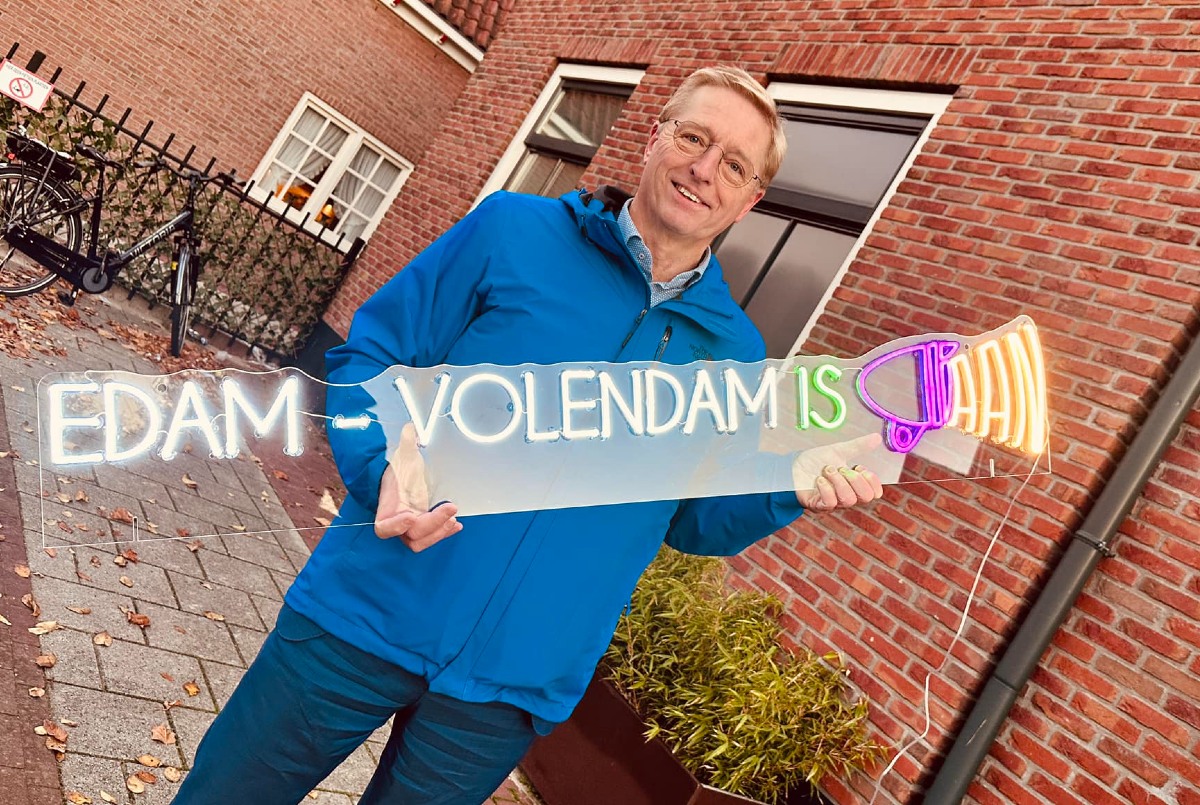 Gemeente Edam-Volendam – Wethouder Kees Schilder (verkeer, vervoer en parkeren) heeft vanochtend om 08.00 uur het startsein gegeven voor de campagne ‘Edam-Volendam is AAN’. Dit deed hij door eerste het neon-sign met de tekst ‘Edam-Volendam is AAN’ aan te zetten. Het doel van de neon-signs is om fietsers ook in het donker eraan te herinneren hun fietsverlichting aan te zetten.