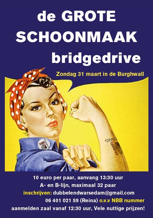 Bridgeclub Dubbel & Dwars Edam organiseert op zondag 31 maart om 13.00 uur de Grote Schoonmaak Bridge Drive in de Burghwall aan de Achterhaven 89. Uiteraard zijn er ook dit keer weer lekkere en nuttige prijsjes te verdienen.