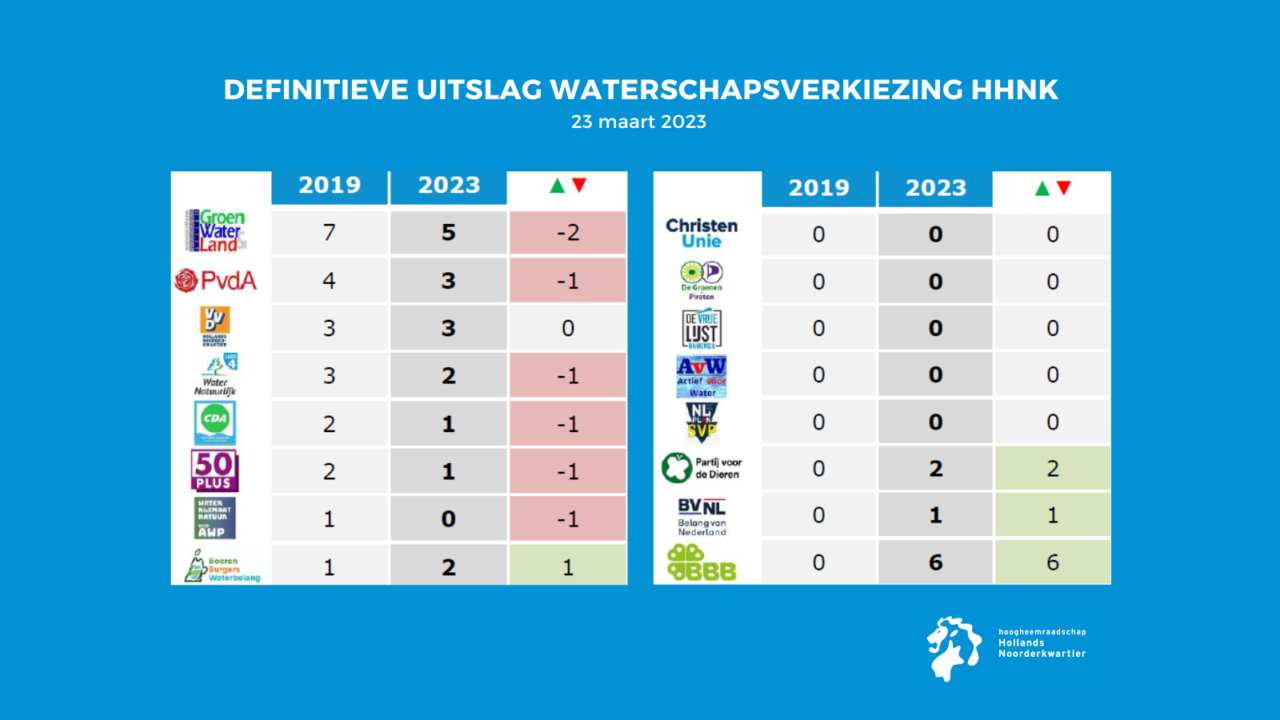 Regio Waterland – De definitieve uitslag van de verkiezing voor een nieuw bestuur van Hoogheemraadschap Hollands Noorderkwartier is bekend. De verkiezingen van 15 maart hadden in het beheergebied van het hoogheemraadschap een opkomstpercentage van 53,2%. In totaal brachten 512.981 Noord-Hollanders hun stem uit.
