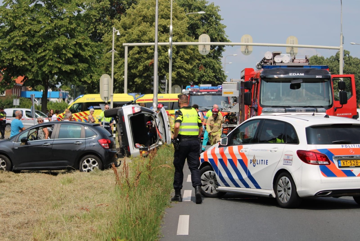 Bij de kruising Hoornsejaagweg/Molenwerf in Edam zijn vanmiddag rond 14.15 uur twee auto’s op elkaar gebotst. Door de klap belandde een van de auto’s in het water. Het andere voertuig kantelde en kwam op de zijkant tot stilstand in het gras langs de weg.