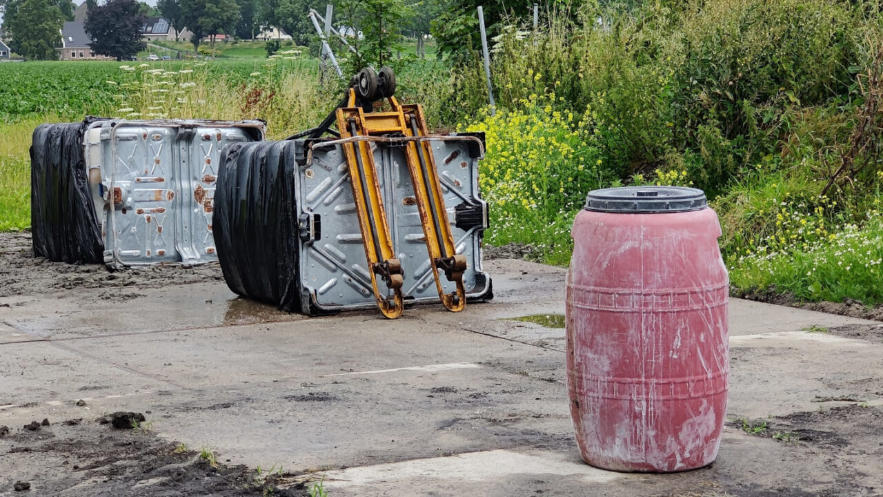 Aan de betreffende weg waren twee ibs kuub containers en een vat aangetroffen. De twee containers lagen op hun zij en had nog een pompwagen eronder. De politie had de brandweer opgeroepen om een meting te doen.