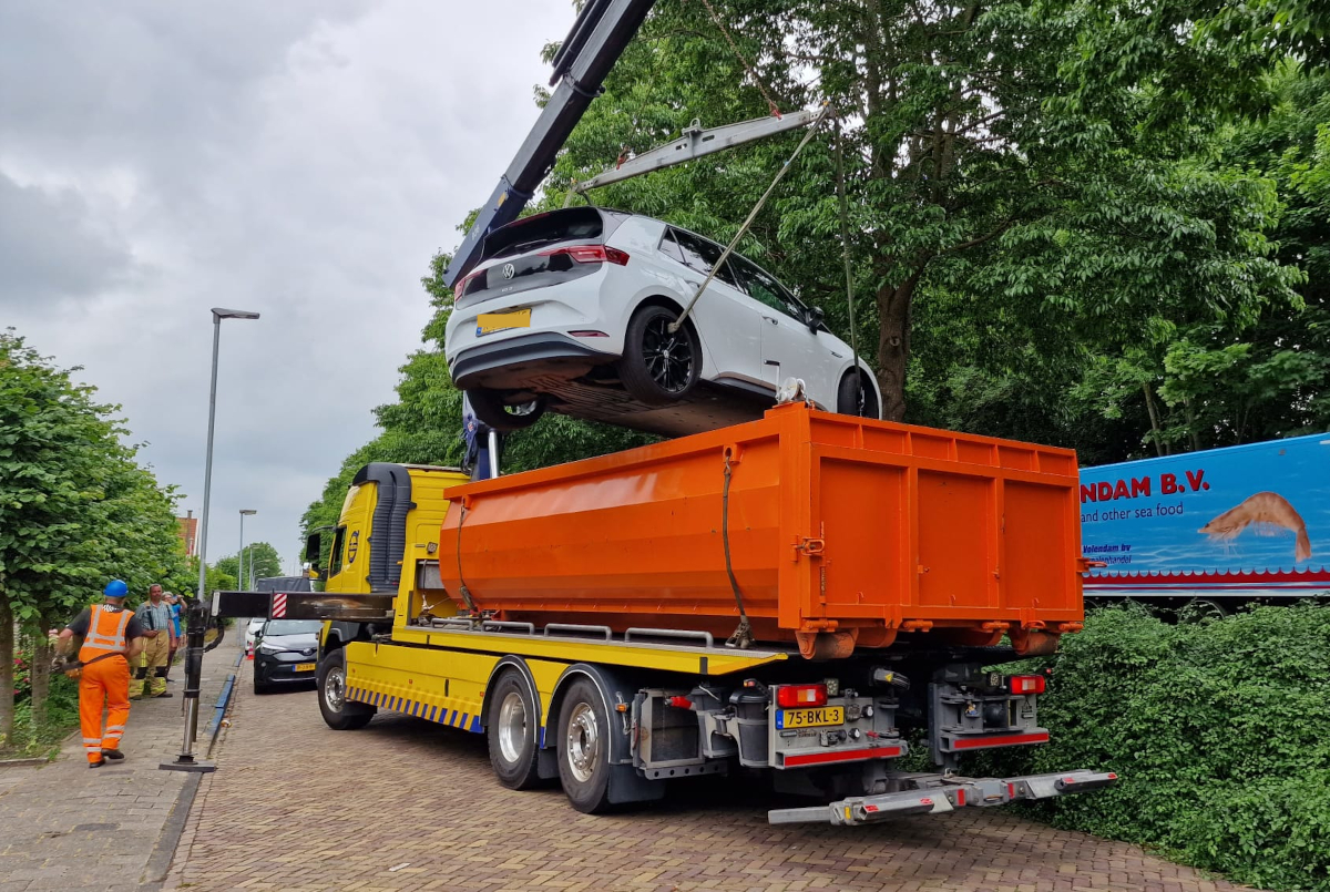 Toen de ANWB ontdekte dat de elektrische auto bijna in brand zou vliegen werd direct de brandweer opgeroepen. Deze zette de straat af en bevestigde een touw aan het voertuig, zodat deze weggetrokken zou kunnen worden bij eventuele brand. In de tussentijd werd een zogeheten dompelbak opgeroepen. Ongeveer twee uur na de oproep was de dompelbak ter plaatse en kon het voertuig erin gehesen worden.