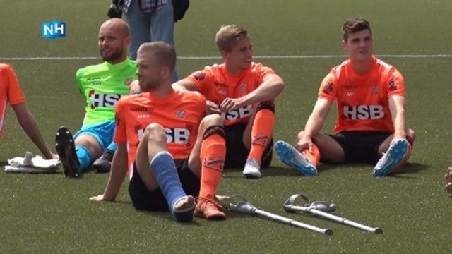 Gijs Smal meldde zich donderdagmiddag op krukken bij de traditionele fotopersdag van FC Volendam. De linksback is geblesseerd aan zijn rechterenkel en de komende weken uitgeschakeld.