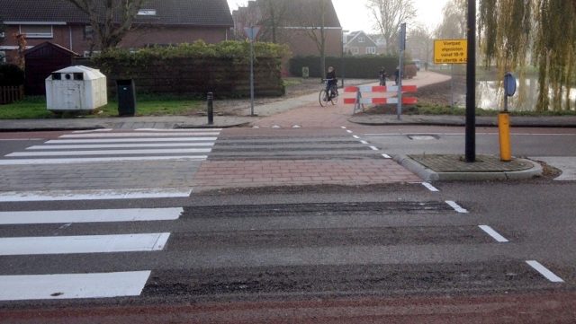 Het vernieuwde fiets-/voetpad tussen de Chr. van Abkoudestraat en A.P. Schotelstraat was al helemaal aangelegd, maar het wachten was op de afronding van de oversteekplaats op de Chr. van Abkoudestraat.