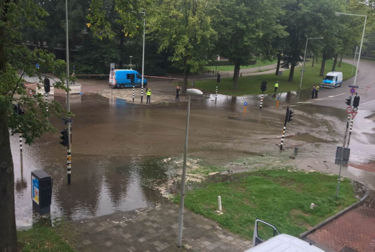 De IJdoornlaan in Amsterdam-Noord staat momenteel onder water. Dat komt door een gesprongen waterleiding. De straat is met linten afgezet en de bussen van het GVB worden ook omgeleid.