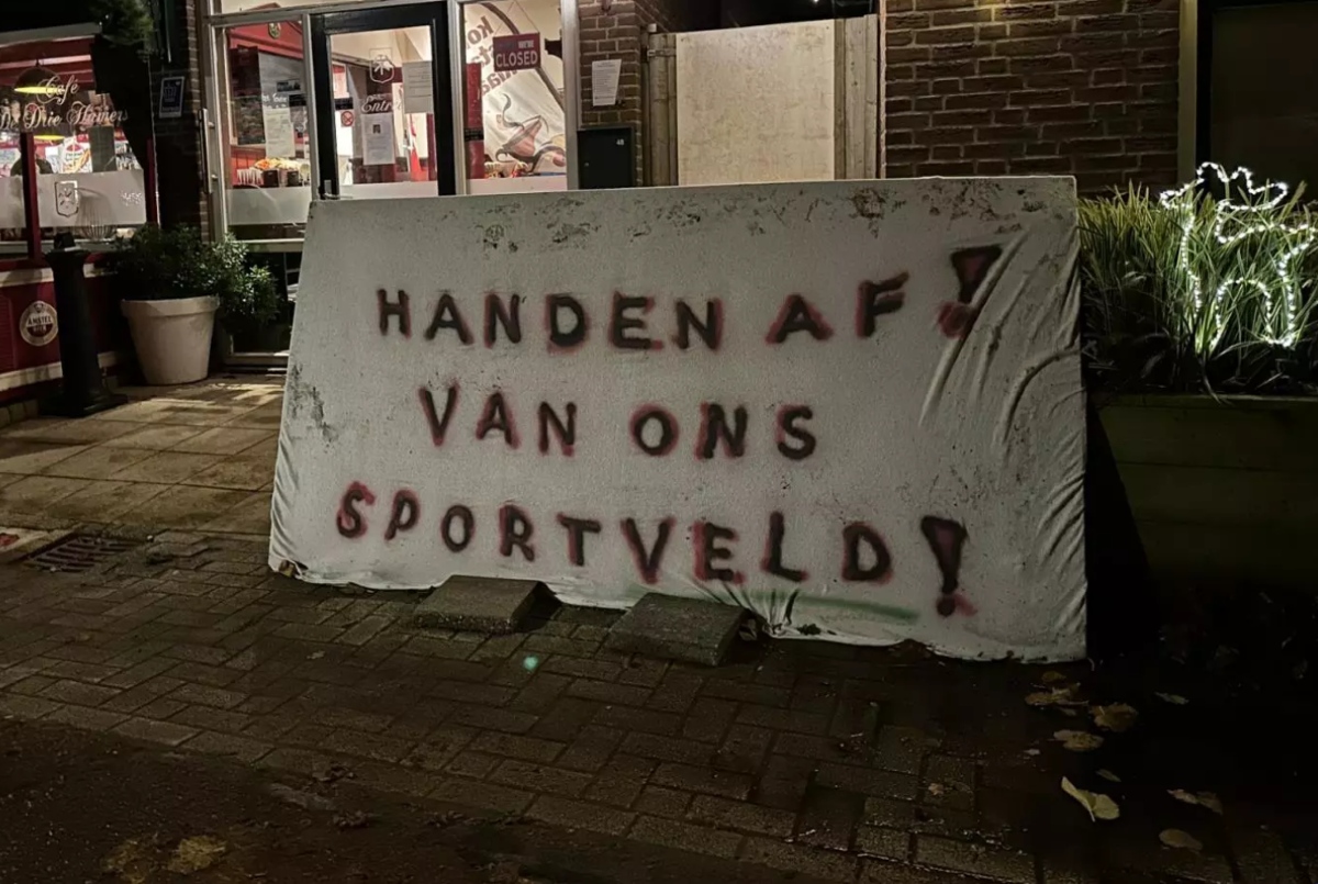 Het is duidelijk: het vooruitzicht dat op dit veld tijdelijke woningen komen is voor veel inwoners een schrikbeeld. Bij het inrijden van het dorp hangen er spandoeken en ook voor café De Drie Hamers hangt er één: ‘Handen af van ons sportveld!’.