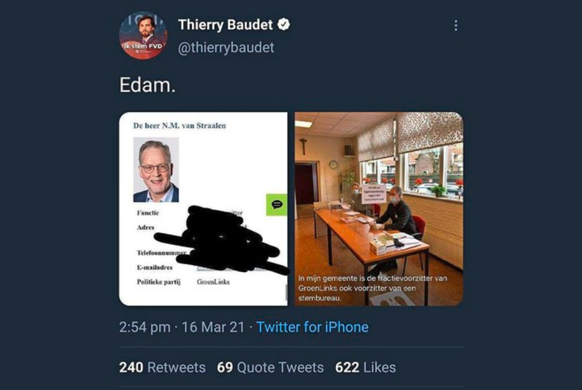 Gisteren plaatste de heer Baudet, fractievoorzitter van het FVD, een Tweet waarin hij de suggestie wekte dat de betrouwbaarheid van Nico van Stralen als voorzitter van een stembureau binnen onze gemeente in twijfel getrokken zou kunnen worden. Niet alleen plaatste hij een Tweet met foto van de Edamse fractievoorzitter van GroenLinks,, maar er werden tevens persoonsgegevens, waaronder zijn adres, gedeeld.