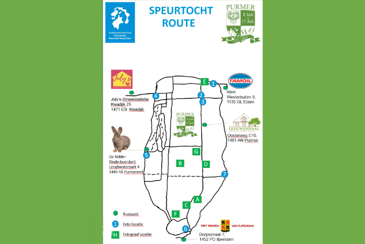 Ga fietsend, lopend, skeelerend, joggend, vliegerend of (als het kan) zelfs schaatsend de Purmerpolder rond. De route is ongeveer 25 km lang. Onderweg kom je, bij de 7 ingangen van de Purmerpolder aankondigingsborden ‘Purmer 400 jaar’ tegen. Deze borden zijn samen met het Hoogheemraadschap Hollands Noorderkwartier (HHNK) geplaatst. Op elk bord staat een foto die ergens in de Purmer is gemaakt. Raad voor alle borden de locatie waar de foto’s zijn gemaakt. Alle 7 borden zijn aangegeven op de plattegrond/route met een cijfer. De fotolocaties (waar is de foto gemaakt?) staan ook op de plattegrond/route maar met een letter. Koppel de nummers aan de letters en stuur deze oplossing in.