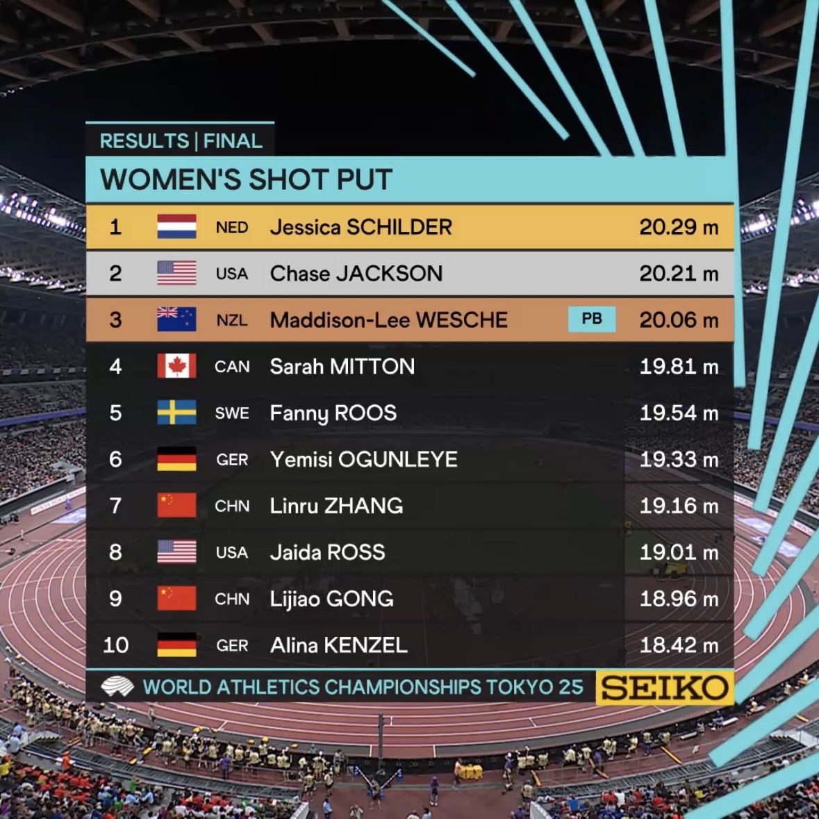 Het leek nog even spannend te worden toen na Schilder haar grootste concurrenten, Chase Jackson (VS) en Sarah Mitton (Canada), hun laatste pogingen waagden. Jackson stootte 20,21 meter en eindigde als tweede, terwijl Mitton met een afstand van 19,81 meter de vierde plek veroverde. De Nieuw-Zeelandse Maddison Wesche pakte de bronzen medaille met een stoot van 19,92 meter.