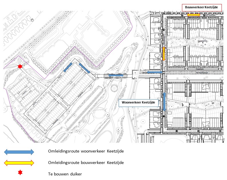 Let op: In deze periode is de wijk Keetzijde uitsluitend te bereiken via de Broeckgouw over een tijdelijke ontsluitingsweg door het natuurpark. Bouwverkeer met de bestemming Keetzijde wordt omgeleid via de Den Oeverlaan en de bouwweg.