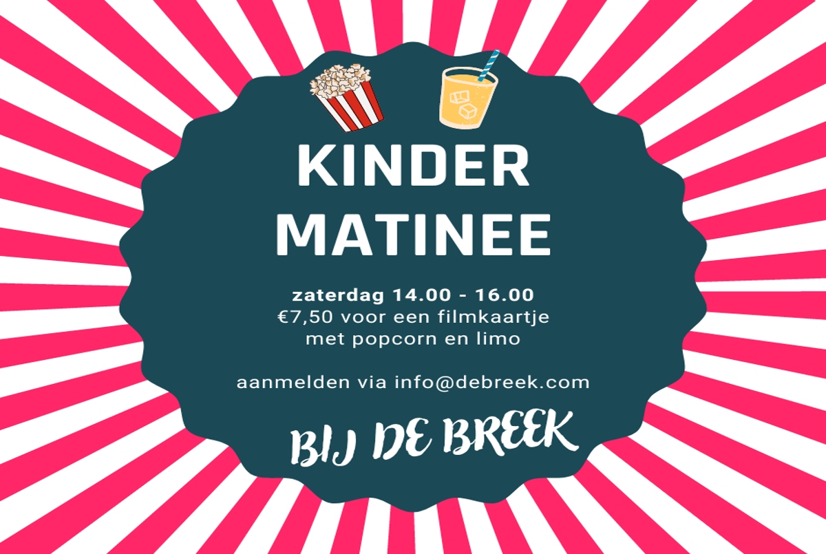 Een filmkaartje kost €7,50 met popcorn en limo erbij. Ook de knutselspullen liggen al klaar! Graag van tevoren reserveren via info@debreek.com of via Whatsapp : 06 – 21 42 09 90.