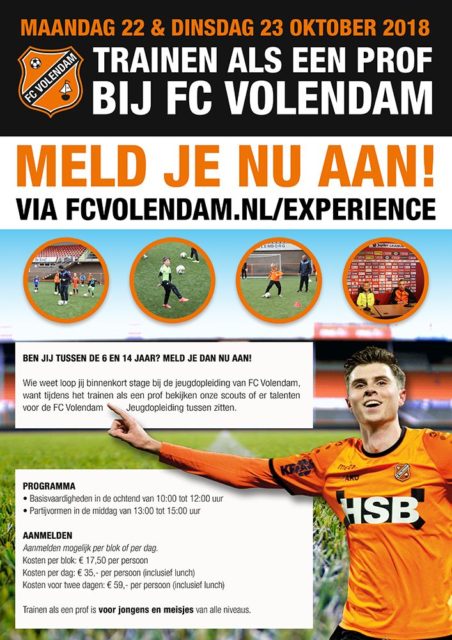 In de herfstvakantie is het voor alle spelers van 6 t/m 14 jaar mogelijk om te trainen als een prof bij FC Volendam! Onder begeleiding van de trainers en spelers van de jeugdopleiding en onder het toeziend oog van de scouting zal er op beiden dagen in twee blokken getraind worden: