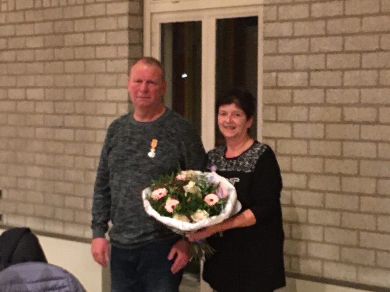 Vanwege de Corona-beperkingen vond de uitreiking plaats in kleine kring in het vergadercentrum van de gemeente. Locoburgemeester Albert Koning reikte het lintje uit aan Anja die het daarna Coronaproof mocht opspelden bij haar man.