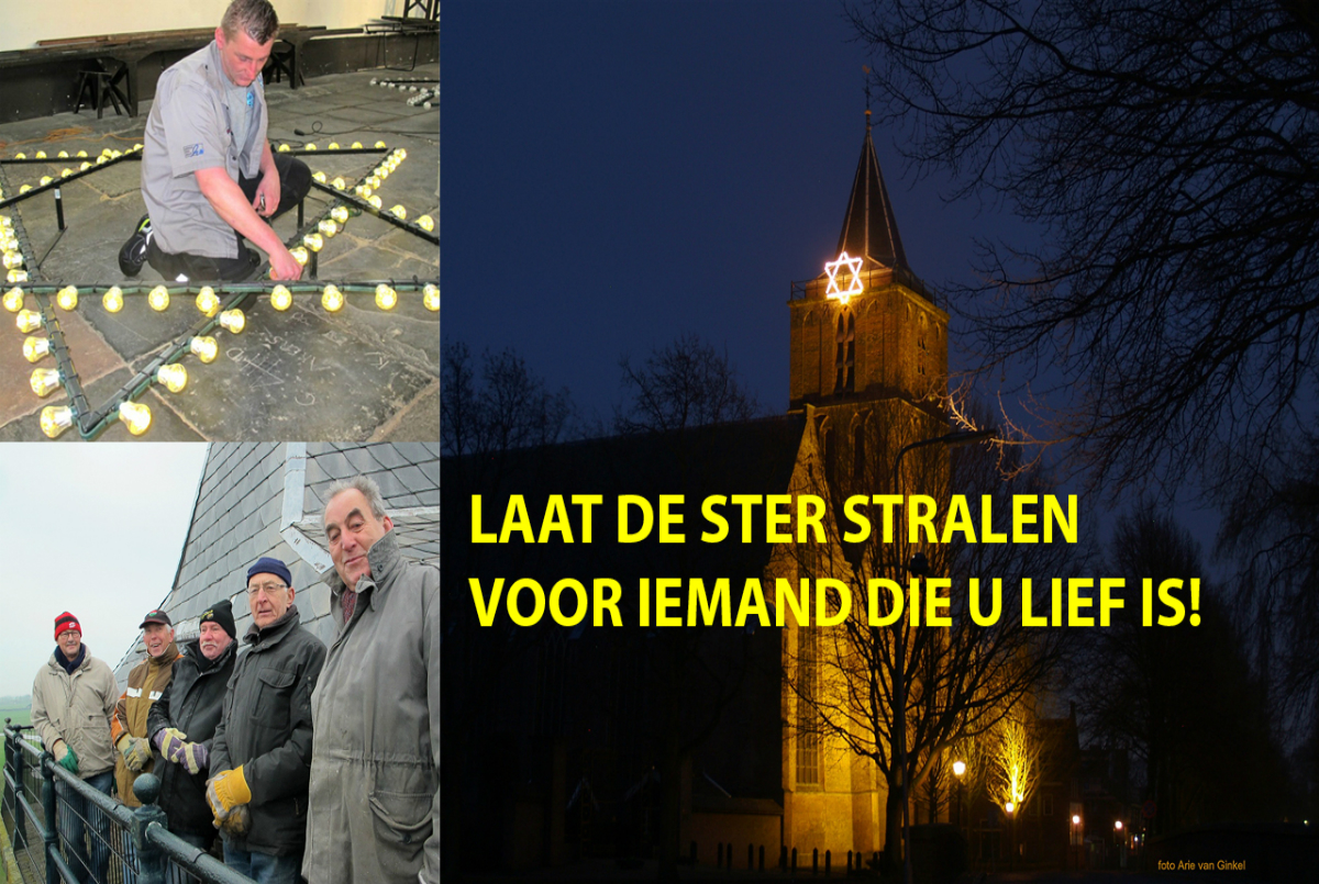 Binnenkort staat ie er weer: de stralende kerstster op de Grote Kerk. De ‘sterrenploeg’ plaatst ‘m elk jaar met zichtbaar plezier op de hoogste top van de gemeente. Hierdoor is de ster voor iedereen zo’n 30 dagen goed zichtbaar.