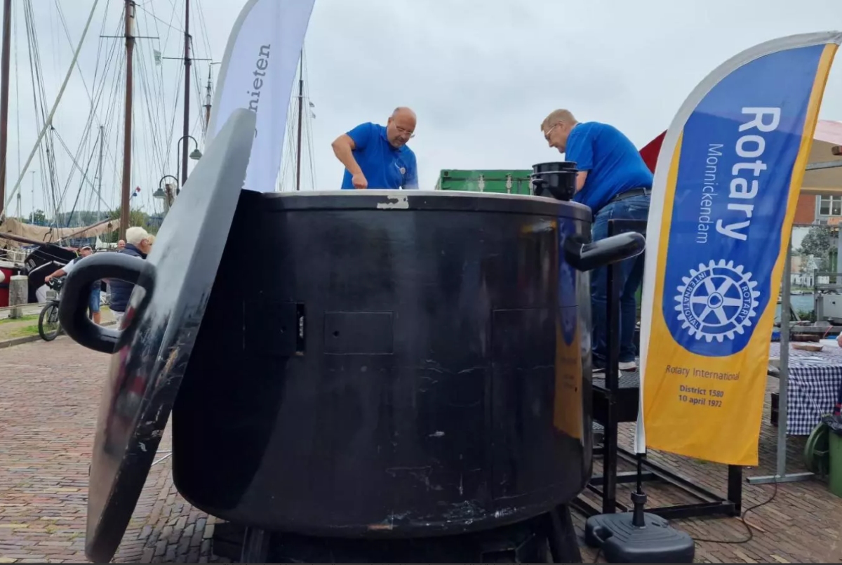 De pan stond er overigens niet alleen voor de sier. De bakjes mosselen werden door de Rotary verkocht voor Open Eettafel: een initiatief waarbij een groep senioren in Monnickendam eenmaal per maand samen een maaltijd nuttigt. De organisatie sponsort deze maaltijden met de opbrengst van de mosselen.