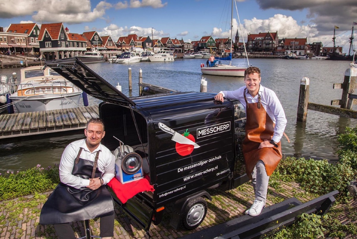 Wat begon als een cursus messenslijpen is voor Edammers Mark Picavet (28) en Niek Foley (31) uitgegroeid tot een bedrijf, een mobiele slijpservice voor messen en soms ook beitels: „Laatst kwam iemand aan met een bijl, of dat kan moeten we nog even bekijken”, laat hij in het Noordhollands Dagblad weten.