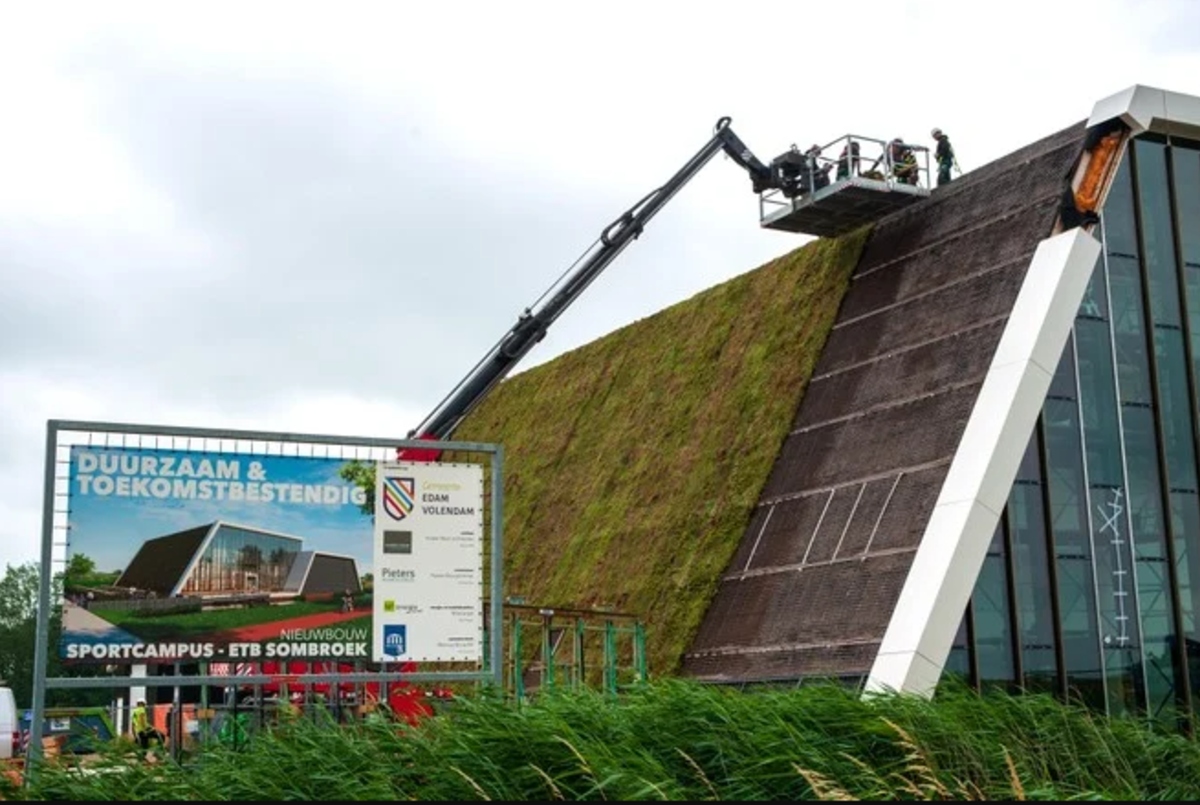 Het nieuwe gymsportcentrum in de Volendamse wijk Broeckgouw wordt geheel in duurzame stijl gebouwd. Daarom is er voor gekozen om de grote zijwand van de hal geheel te voorzien van sedum en andere vetachtige planten.