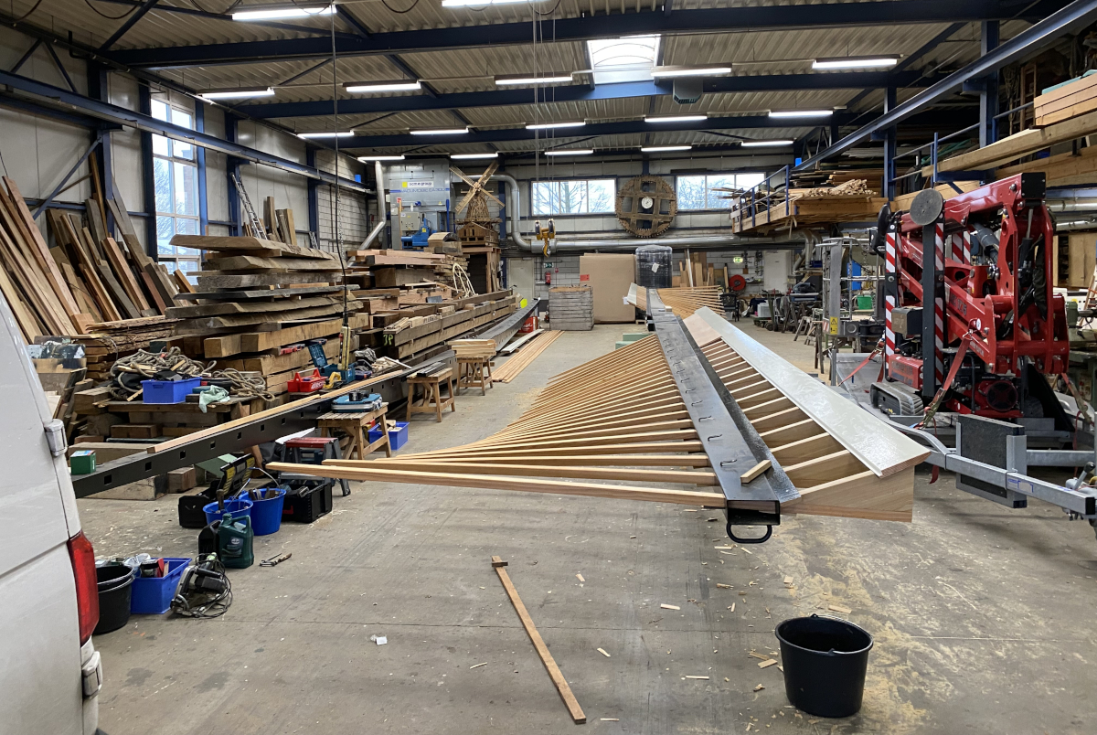 Met behulp van een hoogwerker worden de wieken van elk ruim twee ton op hun plaats gebracht. Een indrukwekkende operatie. Dit alles onder voorbehoud van de weersituatie. Bij slecht weer worden de werkzaamheden uitgesteld. Raadpleeg vooraf molens.nl, de website van De Hollandsche Molen, eigenaar van deze molen, voor de laatste informatie over de planning.