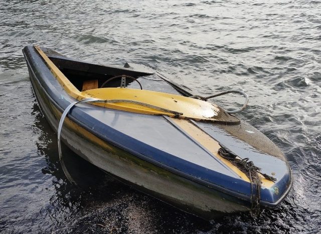 In de golf van Ma, het water achter het Zuideinde bij het Slobbeland in Volendam, ligt een bootje (bijna) onder water.