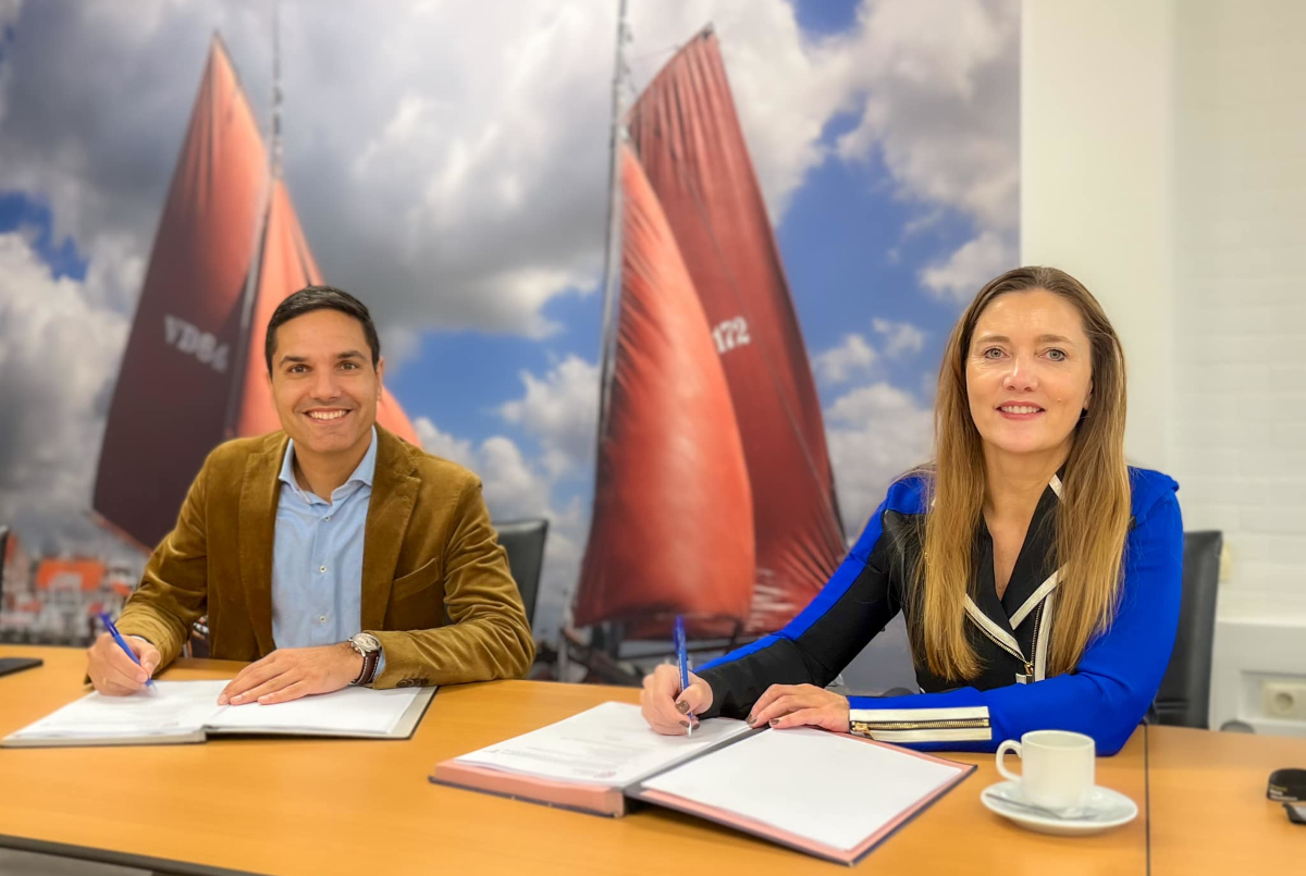 Wethouder Marisa Kes en directeur van Wooncompagnie Stefan van Schaik hebben hun handtekeningen gezet onder de overeenkomst om 28 sociale huurwoningen te bouwen aan de Noorderstraat in Edam.