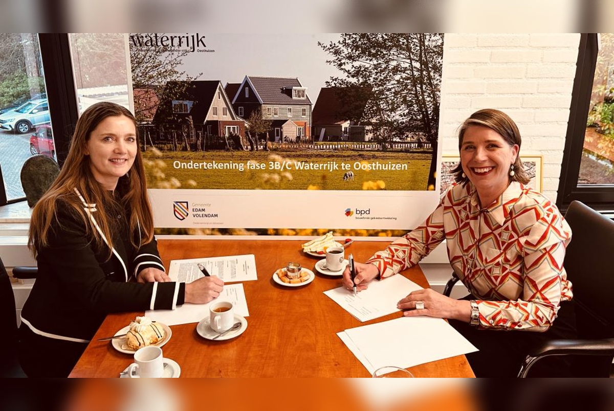 Oosthuizen – Wethouder Marisa Kes en Esther Agricola (regiodirecteur BPD | Bouwfonds Gebiedsontwikkeling) hebben afgelopen dinsdag de overeenkomst getekend voor de bouw van de laatste woningen in Waterrijk Oosthuizen (fase 3B/C).
