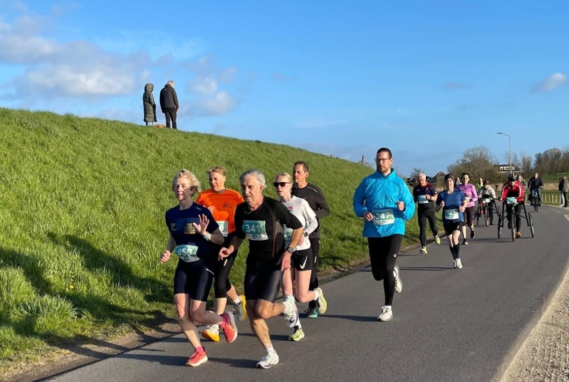 Na het startschot ontstond er direct een kopgroep met daarin onder meer de lokale “super-tridente” Thijs Mossel, Joost Zaunbrecher en Nico Zwarthoed. Na een ietwat door de tegenwind behouden eerste deel troefde Thijs zijn naaste belagers met enkele ferme versnellingen af in het tweede deel en soleerde in een tijd van 16:29 naar de overwinning. Joost liep met 16:41 naar een mooie tweede plaats. Sinds Joost in voorbereiding is voor de Leiden Marathon lijkt hij weer op zijn oude niveau te komen. Met een solide 16:49 maakte Nico het podium compleet.