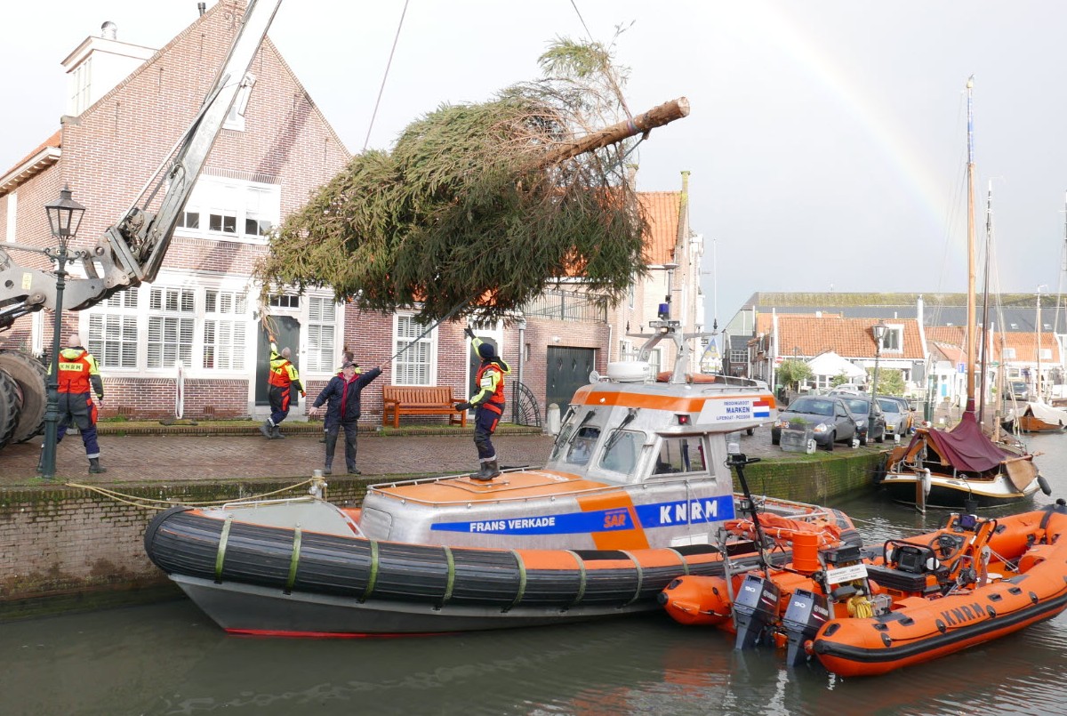 Na flink wat manoeuvres werd de kerstboom vakkundig aan boord van de Frans Verkade gehesen. De boom werd vervolgens stevig vastgemaakt om de overtocht naar Marken veilig te kunnen maken. De Lange Brug werd geopend en de kerstboom ging op weg naar zijn eindbestemming. Rotaryclub Monnickendam hoopt dat de stoere vrijwilligers van KRNM station Marken er door deze donatie warmpjes bijzitten deze winter.