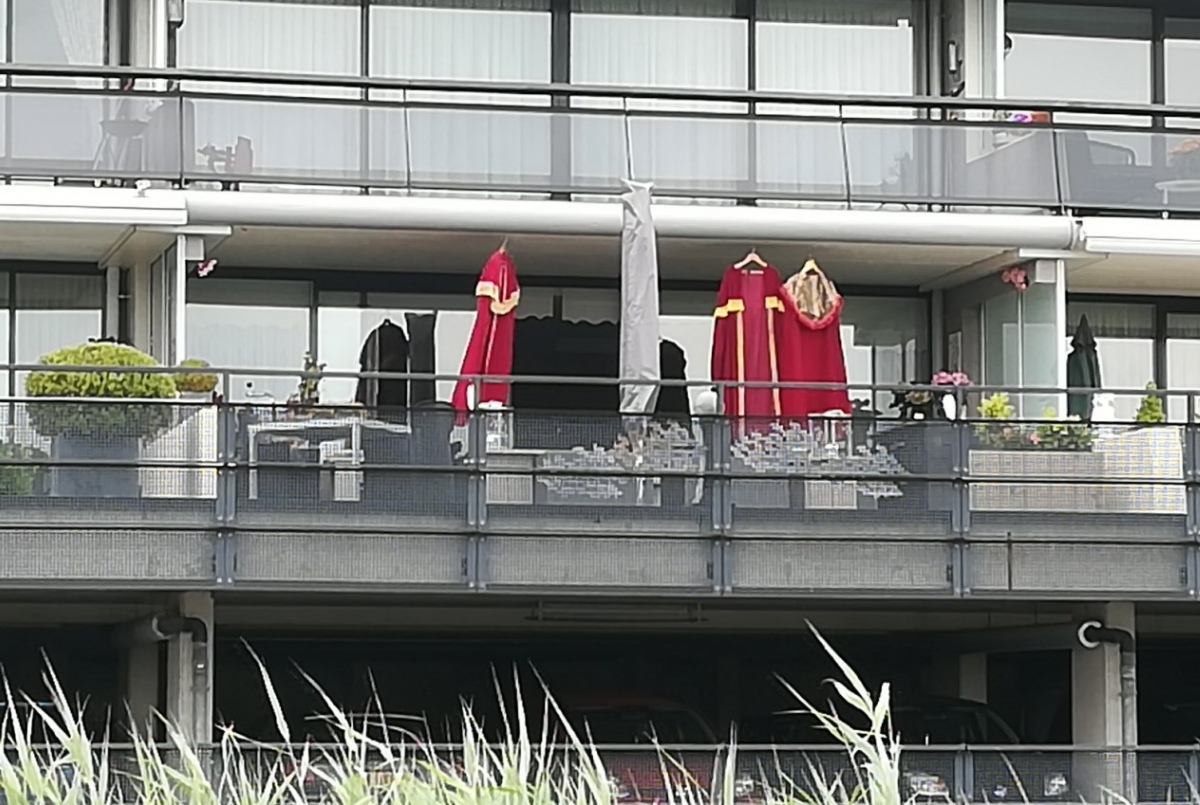 De drie outfits van de goedheiligman op het balkon van een appartementencomplex waren voor Frank een bijzonder gezicht. “Merkwaardig om dat in de zomer te zien. Da’s lachen!”