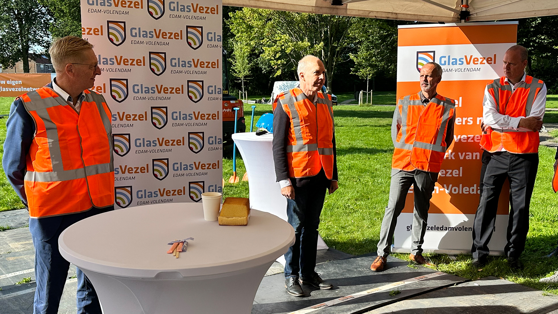 Onder de naam ‘GlasVezel Edam-Volendam’ gaat de joint venture vanaf nu van start met de uitrol van het glasvezelnetwerk. Het startschot hiervoor werd vanochtend gegeven in het bijzijn van de wethouders Dirk Dijkshoorn (Financiën, Energietransitie en Duurzaamheid) en Kees Schilder (Verkeer & Vervoer/OW) en alle betrokken partijen zoals Ziggo/Vodafone, Glasdraad en iedereen die binnenkort hard aan het werk gaat. Wethouder Dijkshoorn had de eer om de eerste graafwerkzaamheden te verrichten.