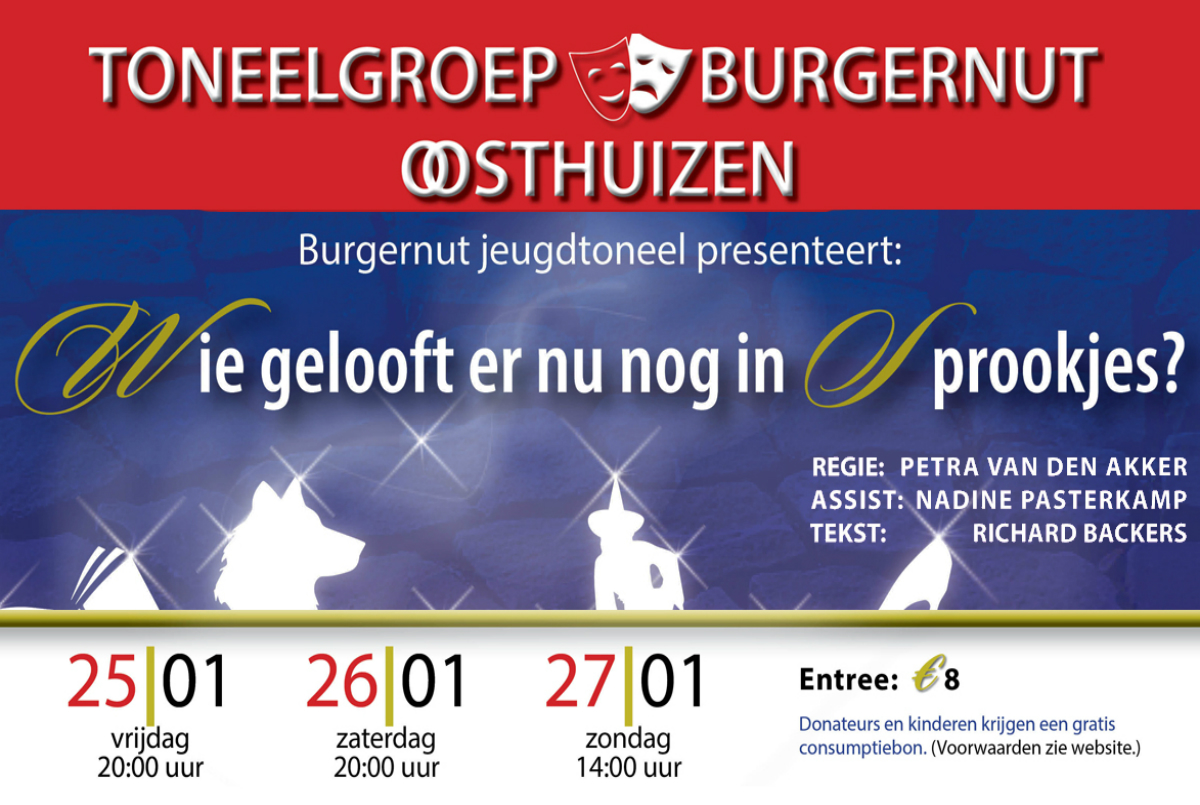 “Wie gelooft er nu nog in Sprookjes” is een vrolijke en spannende voorstelling voor alle leeftijden, gespeeld door het jeugdtoneel van Toneelvereniging Burgernut Oostuizen. In deze tot de verbeelding sprekende voorstelling komt de wereld van de sprookjes op een bijzondere manier tot leven. De voorstelling is geschreven door Richard Backers.