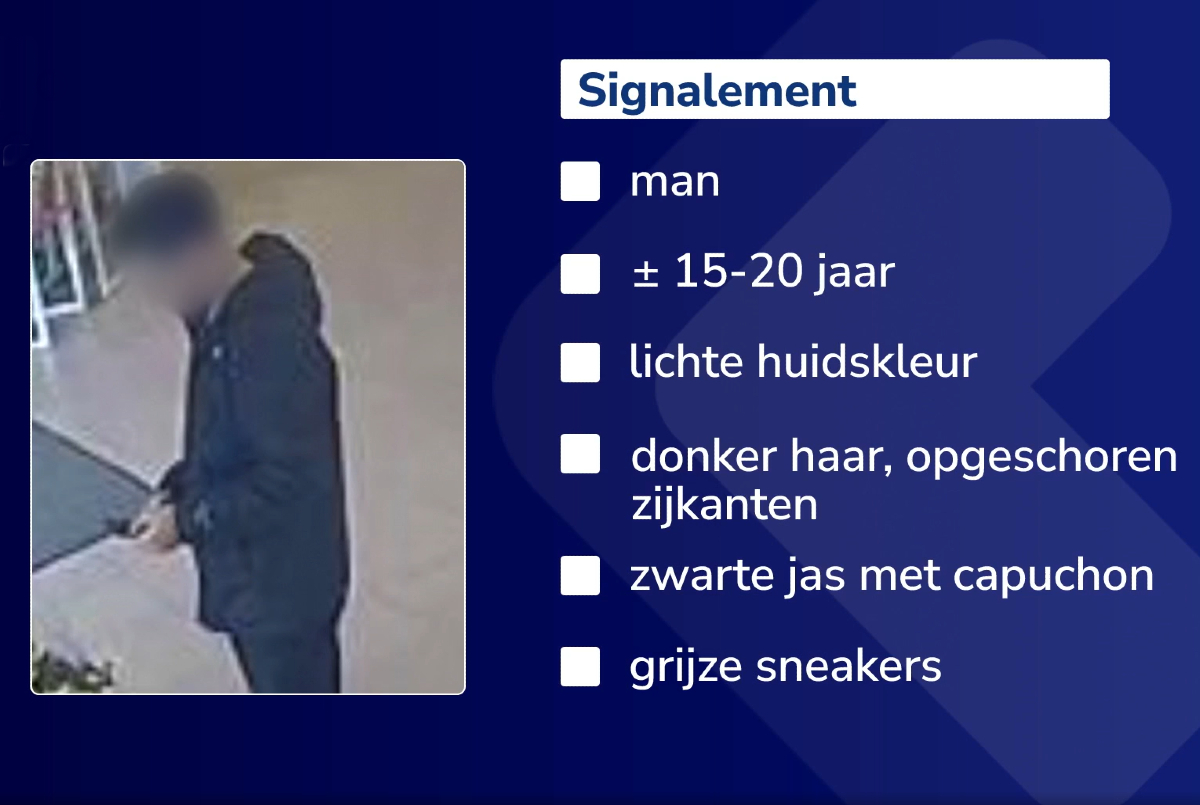 De verdachte heeft een lichte huidskleur, donker haar dat aan de zijkanten kort opgeschoren is en draagt een zwarte jas met capuchon en grijze sneakers. Omdat hij mogelijk minderjarig is, krijgt hij een week de tijd om zich bij de politie te melden. Zo niet, dan verschijnt volgende week wél herkenbaar beeld van hem.