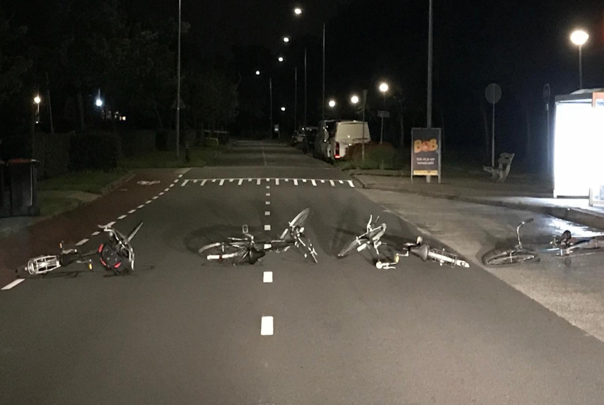 De fietsen waren duidelijk door mensen neergelegd. Er lagen precies over de rijbaan vier fietsen verdeeld, waardoor niemand meer kon passeren.