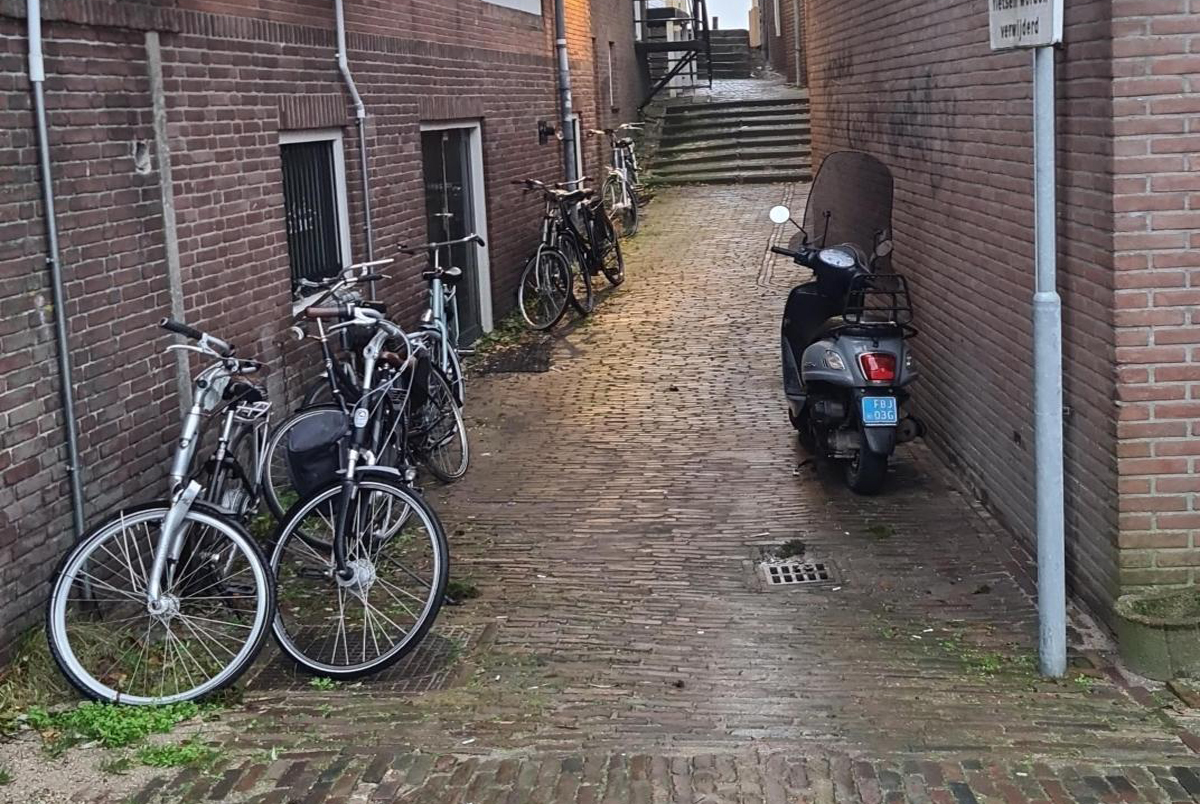 In de steeg bij het Spieringpad in Volendam staan een aantal fietsen.