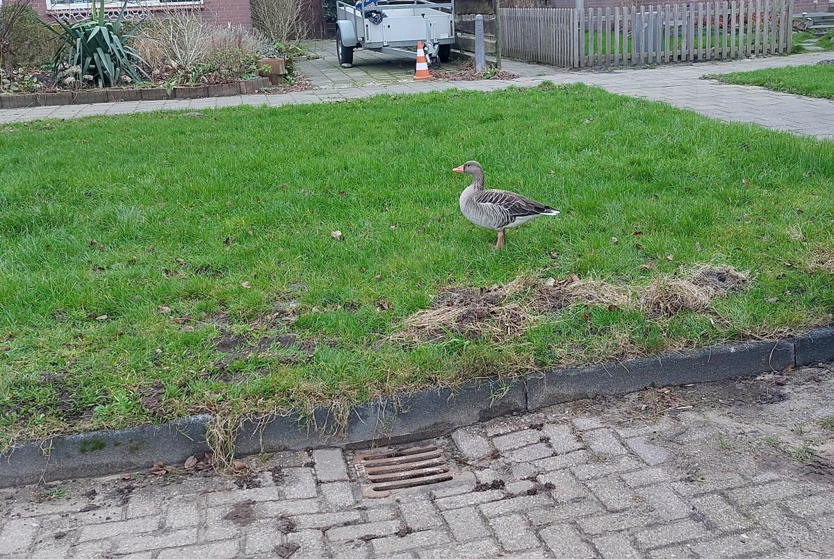 Gisterochtend werd onderstaande gans aangetroffen op een grasveld voor de woningen in de Westerstraat te Warder. Nu stikt het daar van de ganzen, maar een gans helemaal alleen zo dicht bij de huizen vond een bewoonster toch wel gek.