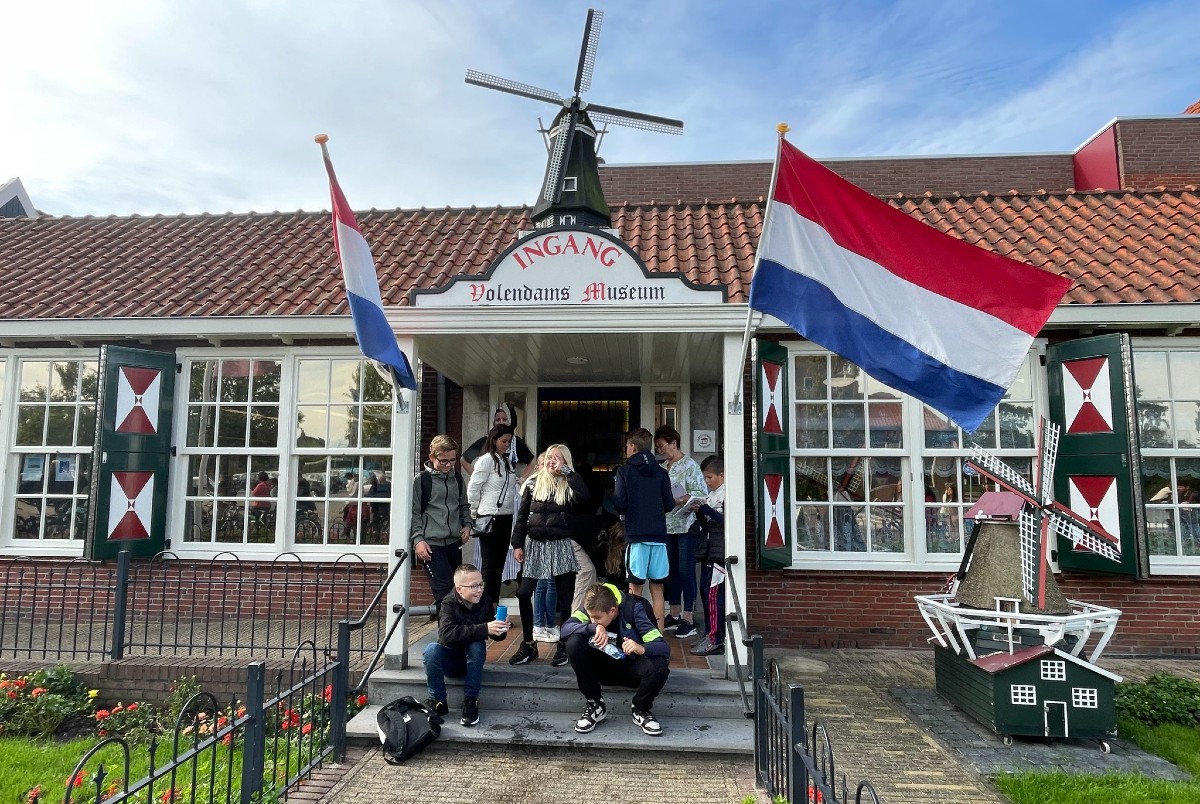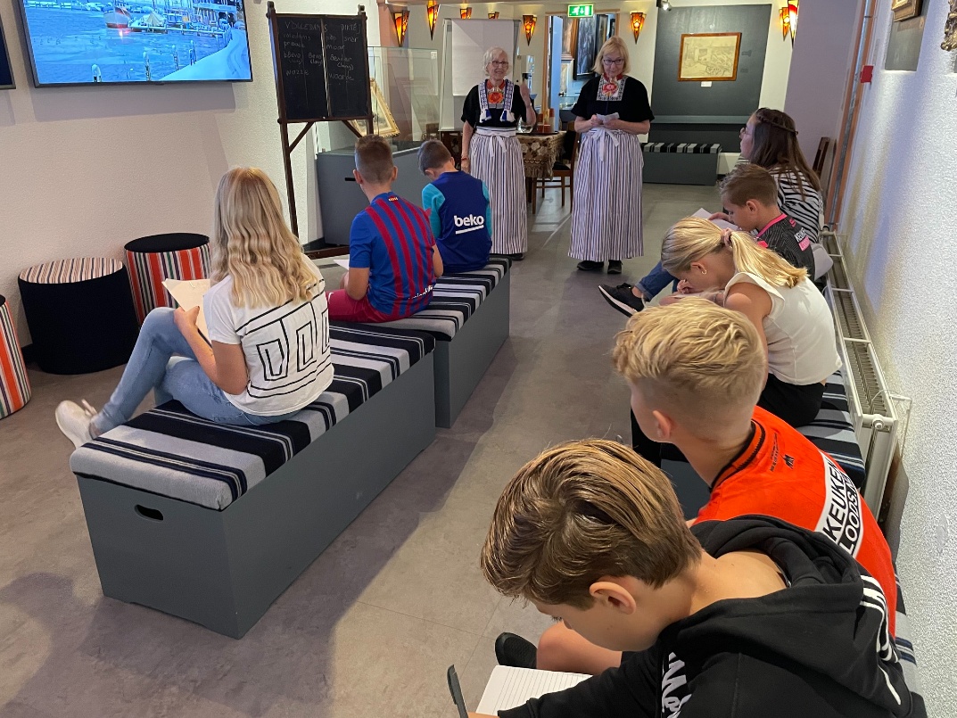 In het Volendams Museum kregen de leerlingen een korte rondleiding met filmbeelden van het Volendam van 100 jaar geleden en een ‘diktéj in t Volledams’. In de oude kom van Volendam was een speurtocht uitgezet met vragen. Hiermee kon een foto in klederdracht met drie vriendjes of vriendinnetjes bij de Volendam Experience worden gewonnen. Overigens bleek het controleren van de antwoorden van deze speurtocht een hele uitdaging!! En het derde onderdeel was een tocht op één van de Volendammer kwakken bij de de Bottervereniging.