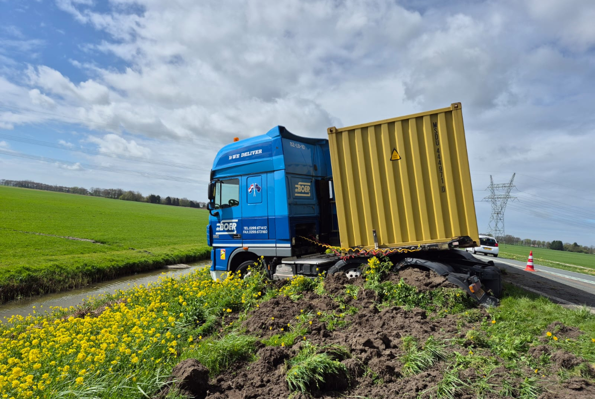 Op de N244 bij Westbeemster is vanmiddag rond kwart voor twee een vrachtwagen vast komen te zitten in de berm.