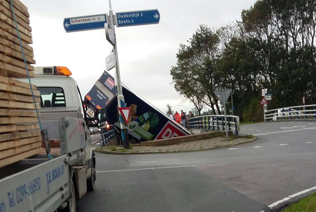Op de N247 in Oudendijk is woensdagochtend een vrachtwagen in het water beland. De vrachtwagen reed over de Dorpsweg naar Hoorn.