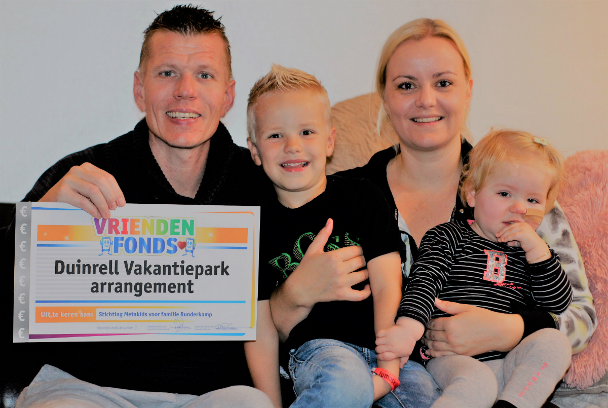 Een grote verrassing voor Johanna Runderkamp (1) uit Volendam. Johanna heeft het syndroom van Alpers Hüttenlocher, een metabole ziekte waardoor haar lichaam een energietekort heeft en niet goed functioneert. Om het 1-jarige meisje en haar broertje Lucas (5) te verrassen, deed Stichting Metakids een aanvraag bij het VriendenFonds van de VriendenLoterij. Johanna en Lucas mogen samen met hun familie een weekje naar Duinrell. Onlangs werd de familie verrast met de cheque.
