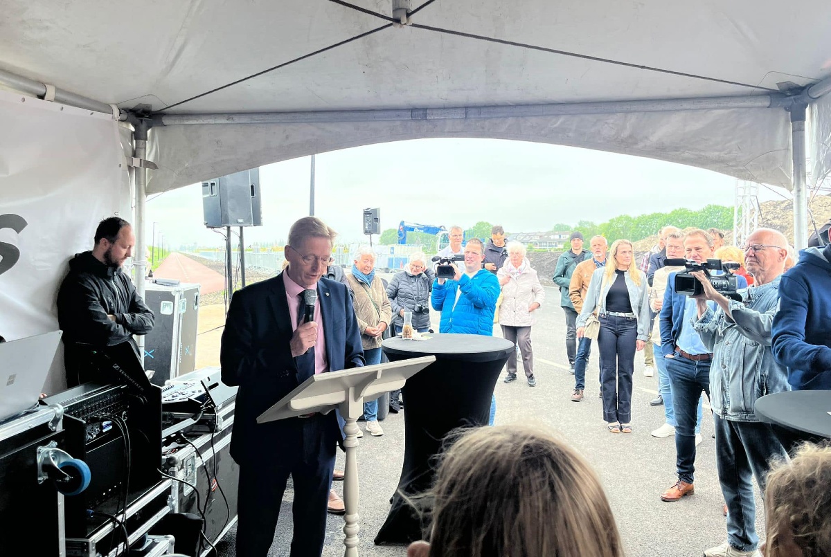 “Al in 1974 werden gesprekken gevoerd over een weg door het weiland. Een paar jaar later werd de verwachte route van de weg, met een stppellijn, aangeduid in het bestemmingsplan Blokgouw 3. En nu, in 2024, vijftig jaar na de eerste gesprekken is de ‘dedre ontsluitingsweg’, zoals de weg tot vandaag werd genoemd, er dan toch gekomen”, aldus wethouder Kees Schilder.