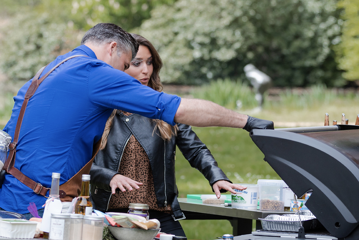 Botje in zijn geheel uit de lamsbout verwijderen, snijd vervolgens de stukje vel eraf. Wrijf de lamsbout op de plek waar het bot zat in met mosterd en de zelfgemaakte pesto. Bestrooi de lamsbout met wat zout, stop er wat tijm tussen en bind vervolgens het vlees. Het opbinden van het vlees is belangrijk omdat het vlees dan gelijkmatig gaart. Gaar de lamsbout naar een kerntemperatuur van 62 graden.