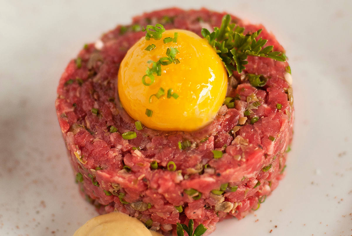 Snijd alle ingrediënten zo fijn mogelijk en meng door elkaar. Breng op smaak met de peper en zout uit de vijzel. Verdeel de steak tartaar over vier borden, doe dit eventueel met een ring en tonicstamper. Serveer met een stuk krokant gebakken stokbrood.