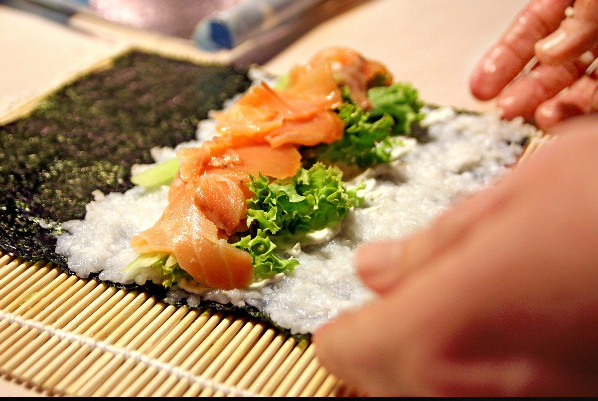 Wrijf een tortilla- of wrapvel in met bieslookkaas. Snijd wat ijsbergsla en was deze af om ook op het vel te leggen. Strooi hier wat fijn gesneden gerookte zalm over. Werk af met wat fijn gesneden bieslook, Italiaanse kruiden en prik er satéprikkers in om de 2 cm en snijd ze dan schuin af. Leg ze netjes op een bord en serveer. Garneer eventueel af met bieslook
